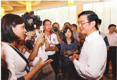 湖南省委書記、省人大常委會(huì)主任周強(qiáng)與海峽兩岸媒體記者親切交談。(湖南日?qǐng)?bào)記者 張目 攝)