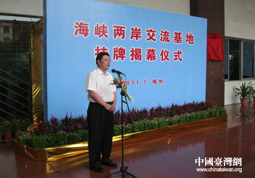 中國臺灣網7月21日梅州消息 7月20日,廣東首個“海峽兩岸交流基地”在梅州舉行掛牌揭幕儀式。梅州市委、市政府主要領導,各縣(市、區)主要領導,市臺辦全體干部等共50多人參加了揭幕儀式。梅州市委副書記陳小山主持掛牌揭幕儀式。