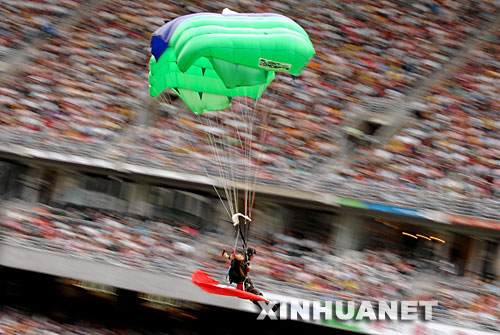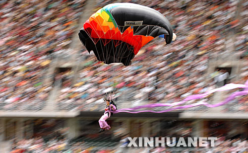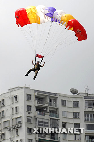 7月2日,解放軍八一跳傘隊隊員在表演。當日,“雄鷹翱翔慶回歸”――解放軍八一跳傘隊表演在香港大球場舉行。新華社記者 呂小煒攝
