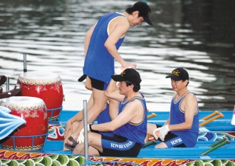 圖為2005年端午龍舟賽前,當(dāng)時(shí)的臺(tái)北市長(zhǎng)馬英九(中)與副市長(zhǎng)金溥聰(左)互相拍手打氣的情形。右為當(dāng)時(shí)另一副市長(zhǎng)葉金川,葉也可能出任黨副秘書長(zhǎng)。