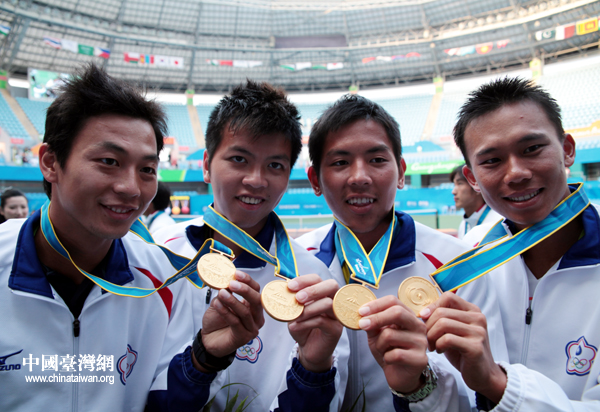 中華臺北隊男網團體選手展示金牌。(中國臺灣網 鐘寶華 攝)
