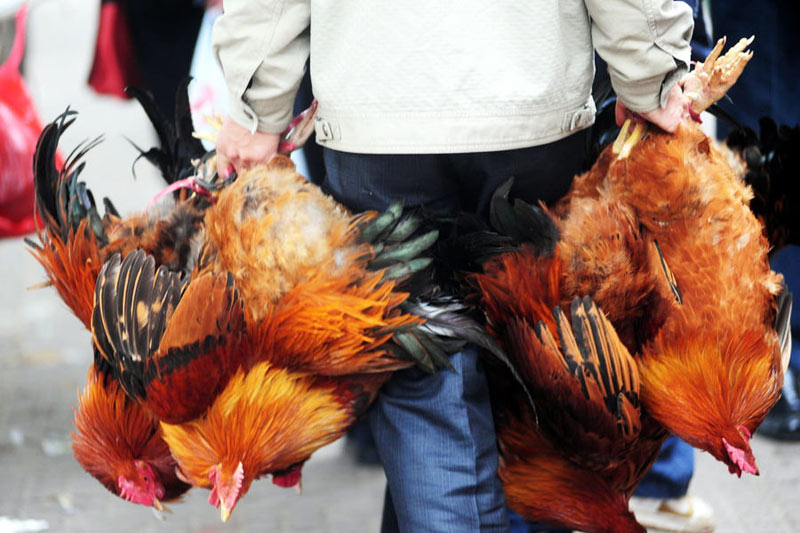 2月1日,海南瓊海,有“無雞不成”傳統的瓊海節前雞市異常火爆,一位市民一次購買數只閹雞。